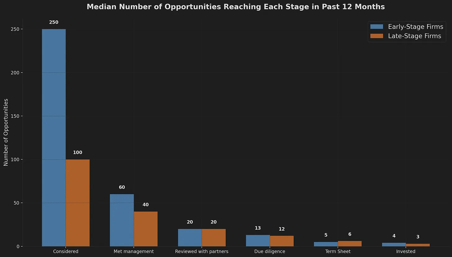 Michael Tefula, in his publication VC Mastery, in a 2024 article, cites studies from Harvard and Stanford that surveyed hundreds of VC funds to understand their typical deal funnel. Their summaries are shown in the graph below: