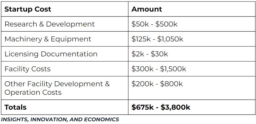 Facility costs generally range from $300k - $1,500k, including the costs for molds, dyes, punches, capital equipment, raw materials, and other necessary items for the manufacturing process.