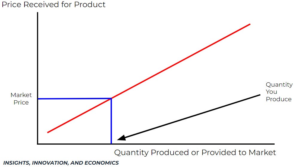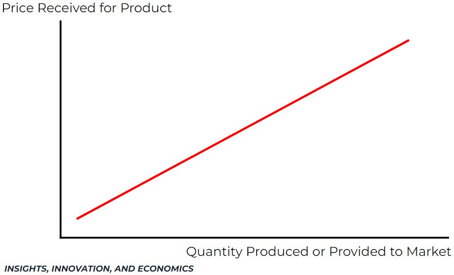 It looks more complicated than it is as the axes are mixed up (welcome to economics). Simply put, as the price of your product increases, the amount or quantity you want to produce increases. In other words, as the price of your product increases, you’re incentivized to produce more and make more money.