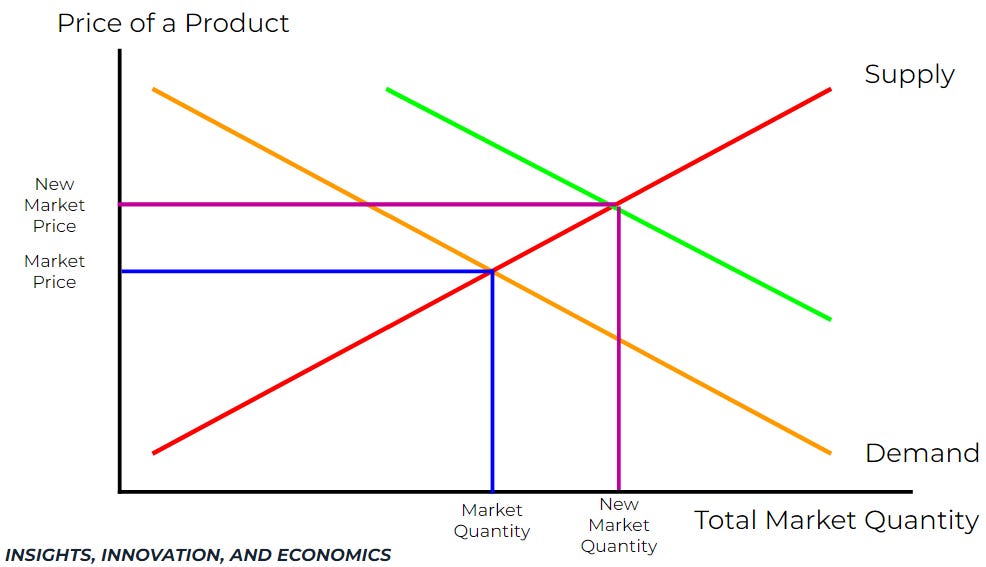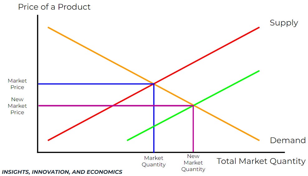 Note how this change in supply affects the quantity and price in the market. As supply increases, price decreases (because the suppliers need to incentivize more people to buy their products that weren’t already, so they lower the price). When the price decreases, demand increases.
