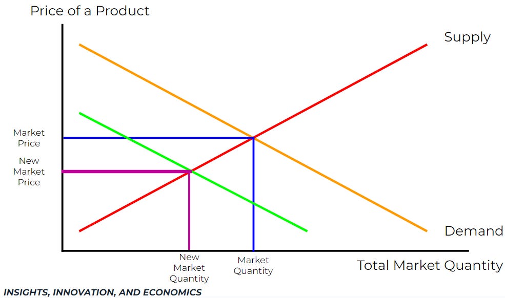 Note how this change in supply affects the quantity and price in the market. As supply decreases, price increases (because there is less quantity, it becomes an auction where the highest bidders win the product). When the price increases, demand decreases.